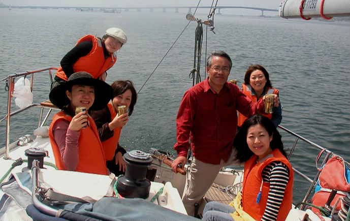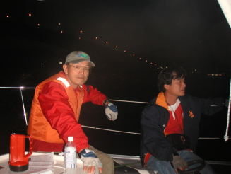 | 雑感!! 湖族の末裔 (中野さんの掲示板から転載) 2002/10/15 (火) 23:09 本部艇への協力を賜り有り難うございました。 南湖はそれほど吹いていませんでしたが、北湖は、5ノット以上で吹いていたようで、 白波があり、セイルのリ−フをしていた艇あったようです。 夜中0:50分頃に倉田さんから電話があり沖の島西で1位の位置と云う連絡があり 慌てて、LWYCの桟橋を出港しました。 (スタ−ト艇を送り出してからは、LWYCに戻りセイラ−ズサロンの羅針盤に行きのんきに呑んでいましたがレ−ス艇は寝る間も無かったようです。) フィニッシュラインを設定するまで、8艇から電話を頂き、早い展開だと思いましたが、沖の島からは、ベタ凪に捕まった艇もあるようで、ス−パ−ヒ−ロさんを初め以外とフィニッシュは遅かったです。 最終レグの沖の島からは、東の方ではなく、志賀沖方面に行った艇が早かったようです。 リミットマ−クと本部艇には、フラッシングライトを点けていましたが、レ−ス艇からは、琵琶湖大橋の灯かりがあり見にくいようで、その後も4艇からフィニッシュラインの問い合わせがありました。 トレ−サ−さんもフィニッシュラインがわからなかったようで残り2艇ですよ、と言うとビックリされていました。 FHは、2:57分にイクチ−。 明るくなってから、アンカ−を上げ、マ−クの撤収に行き6:00にLWYCの桟橋に戻りました。(レ−ス参加者は、艇と車でお休みグ−グ−) LWYCで8:30に上架をして、柳ケ崎に行き、倉田さんに会い、書類を引継ぎました。 本部艇をすると良く見えますが、帰着申告の時間は、いい加減な艇と秒数まで、キッチリ(マゼ艇)記入の艇があり実力がこの書類を見ただけでわかるような気がします。 又、帰着申告の用紙を受け取る時もオ−ナ−の個性があり、強引に渡しに来る艇と、フィニッシュ艇が近づいているのでそちらを優先してから(天福丸艇)とか、MUGENさんのように右舷から渡すよと丁寧に言って頂く艇(常識では、風下から渡して頂くものですが、風上から渡してくれる艇もありました)もあり大変勉強になります。 前回の合同レ−スは、我々のミスもあり色々な意見と批判もありましたが、 今回のナイトレ−スの本部艇(仲間のお遊びの手伝い)を引き受けて良かったように感じます。 10/27のヤマハレ−スは、藻の発生と水位低下で延期で11/23に実施のようです。 |