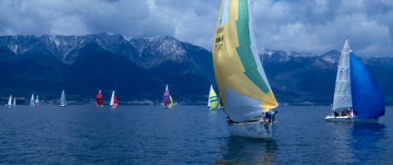 比良連峰の残雪とヨットレースの船団 絵になりますねーーー この日のレースは、クルーが集まらづ やめるつもりでした. しかし,締めきり前日グラシャスの伊東氏からп@「VERANOさんはクルー不足で やめられるそうですね」 「お手伝いしますからどうですか」・・・即 参加 |